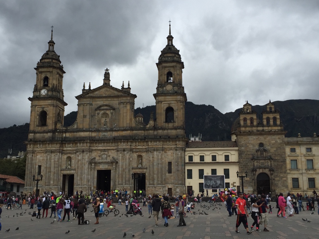 Iniciamos nosso tour de tarde pela Plaza de Bolívar, considerada o ponto central do Centro Histórico de Bogotá. Ela é delimitada pelas Carreras 7 e 8 e as Calles 10 e 11. Ao longo do tempo, os prédios coloniais no entorno da praça foram substituídos por outros mais recentes, alterando a harmonia arquitetônica datada da época dos espanhóis. Palco de muitas manifestações populares, a praça já teve várias funções. Por exemplo, já funcionou como mercado público e até espaço para touradas. Atualmente é reduto dos turistas que circulam por ali, em meio às revoadas de pombos. No centro da praça uma estátua em bronze de Simón Bolívar. Feita pelo artista italiano Pietro Tenerani em 1846, foi o primeiro monumento público da cidade.