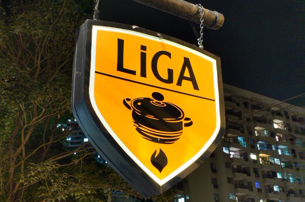 Sob o comando do chef Bruno Vaz, o menu é uma viagem por todas as casas que compõem a Liga. Uma forma de conhecer um pouco de cada, é pedir a Tábua da Liga. Nela são servidos os “mais pedidos” nos bares. Por exemplo, os croquete de joelho de porco defumado e de stracotto na cerveja preta, do Botero. Ainda os bolinhos de arroz recheados de linguiça e mix de queijos, do Momo. Delicioso, o porquinho de quimono, massa de Harumaki recheado com costela suína e requeijão, do Bar da Frente. Para completar, os pastéis de camarão sem creminho e de costela no bafo, do Cachambeer.
