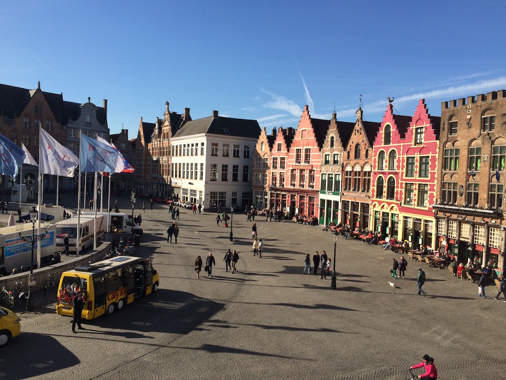 Em seguida, siga para o coração da cidade, o Grote Markt, a praça principal de Bruges. É ali que estão aquelas casinhas belgas coloridas, coladas umas às outras, que sempre vemos nas fotos. Dependendo do dia e do horário há uma feira de alimentos no local, onde é possível comprar queijos, frutas e outros alimentos.